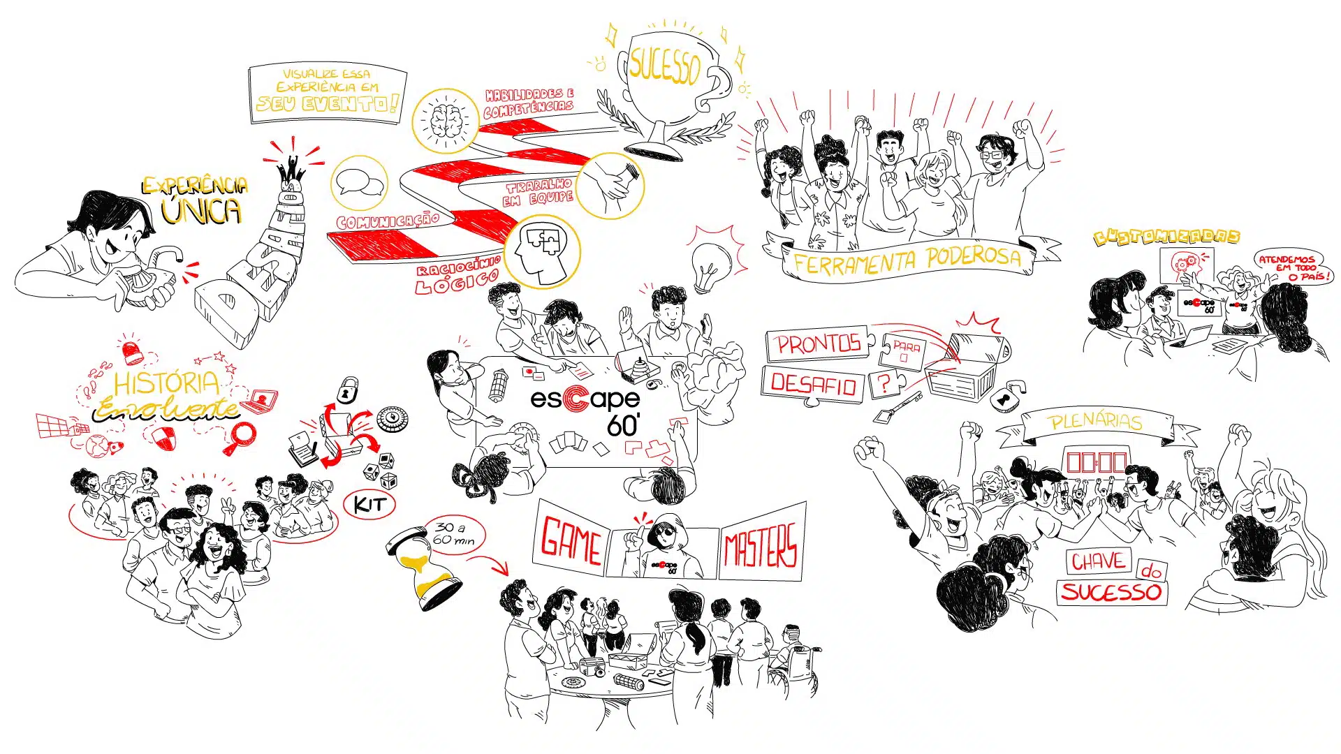 Feito no estilo whiteboard, desenvolvemos ilustrações criativas e uma narrativa rápida para explorar como essa experiência dinâmica estimula o trabalho em equipe e o engajamento no ambiente corporativo.